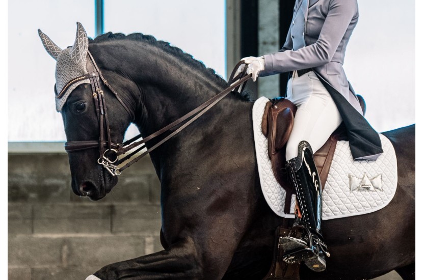 The INFI-KNIT white and grey dressage saddle pad is a TACANTE creation. The first saddle pad entirely knitted in 3D in France, it is made from 30% Newlife® recycled polyester. It sits high on the withers, with excellent coverage to fit different dressage saddles. Its patented girth slot ensures a secure fit under the saddle. The INFI-KNIT saddle pad is machine washable and dries quickly in the open air. Match it with a pretty earnet from our range and with our innovative white and black bandages for a 100% INFI-KNIT look.