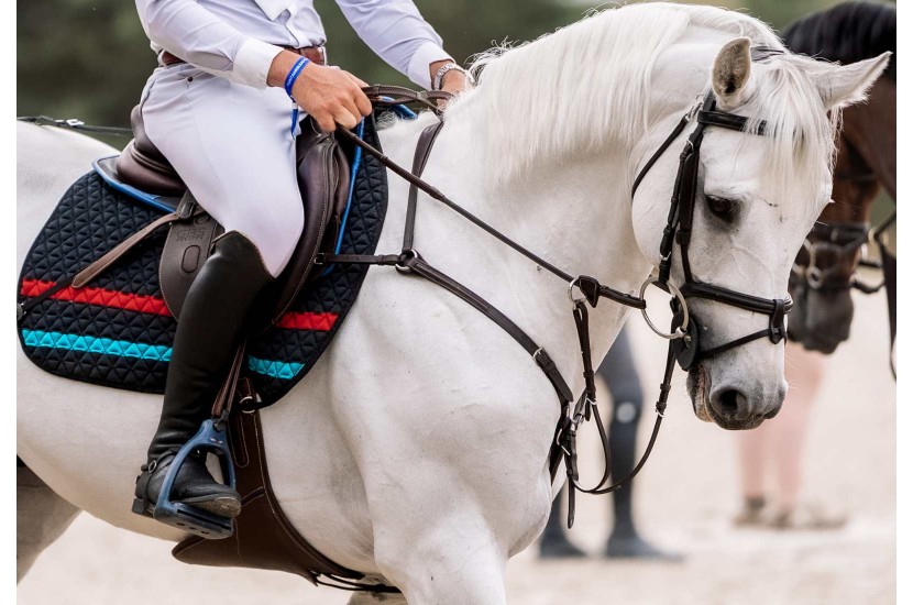 The INFI-KNIT white and grey dressage saddle pad is a TACANTE creation. The first saddle pad entirely knitted in 3D in France, it is made from 30% Newlife® recycled polyester. It sits high on the withers, with excellent coverage to fit different dressage saddles. Its patented girth slot ensures a secure fit under the saddle. The INFI-KNIT saddle pad is machine washable and dries quickly in the open air. Match it with a pretty earnet from our range and with our innovative white and black bandages for a 100% INFI-KNIT look.